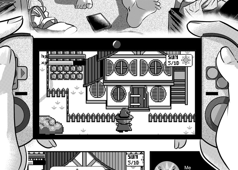 Bonni: Ugh, it’s so difficult to choose! I’m the kind of artist who loves to experiment, and each page in the comic has its own exciting challenge. I really liked drawing the two of them dancing in that double-page spread, but I also really enjoyed drawing the first page as I got to draw everything: a messy hotel room, the main character, a close-up of her game console, and pixel art!